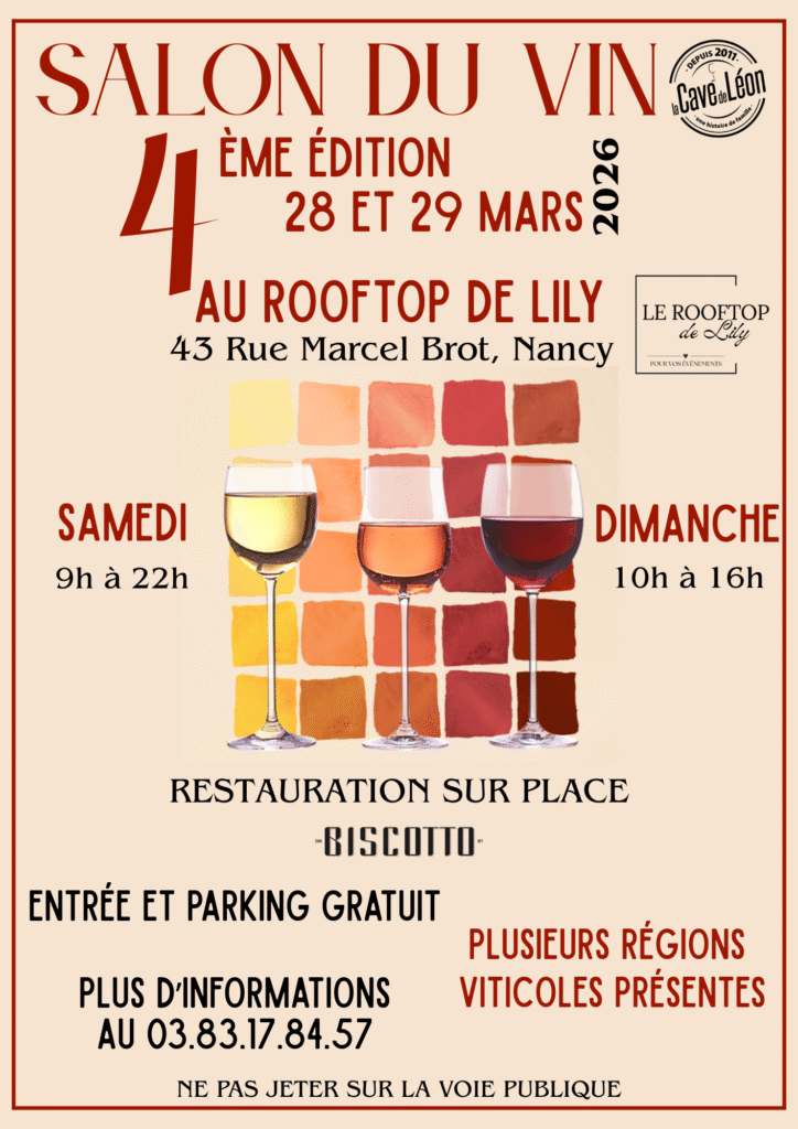 Nous avons l’immense plaisir de vous annoncer notre 4ème édition du Salon du Vin, qui se déroulera les Samedi 28 et Dimanche 29 Mars 2026 au Rooftop de Lily, au 43 rue Marcel Brot à Nancy.
